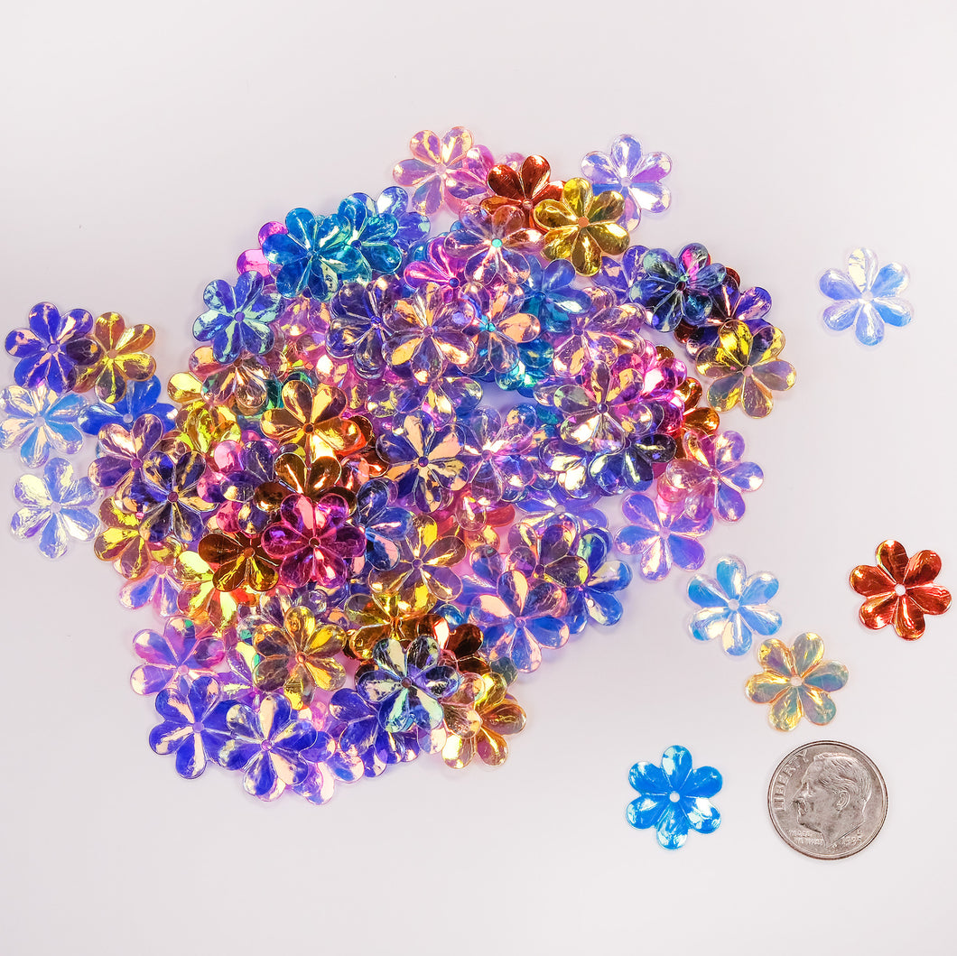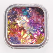 Larger pretty flowers, packaged in a 2" x 2" x 1" square metal tin with a window so you can see what's inside.