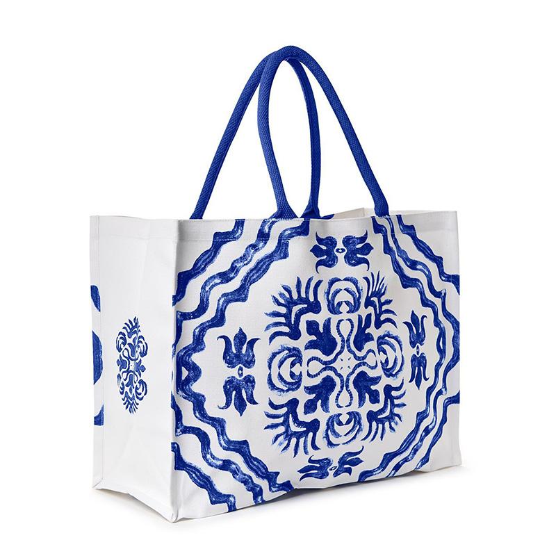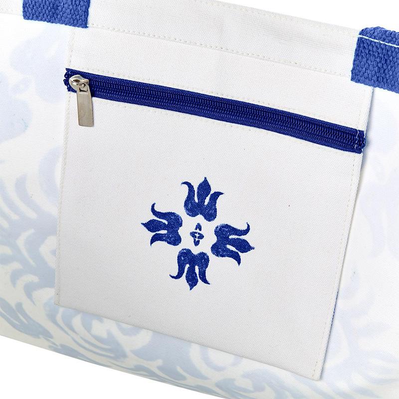 Fresh blue and white tile block print tote with inside zippered pocket. 18"w x 8"d x 14"h. Cotton canvas.